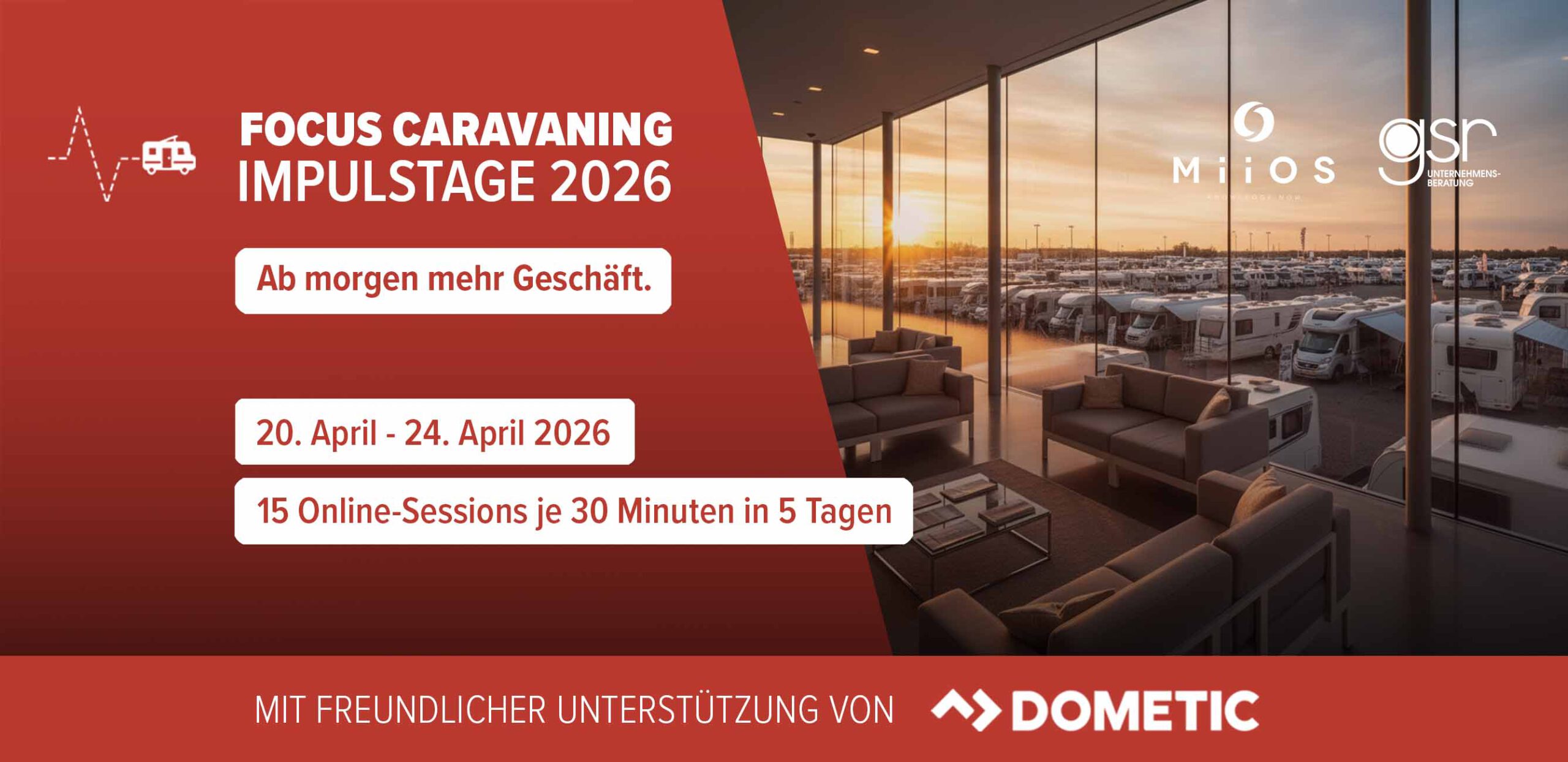 Jeder Tag unserer Impulswoche bietet viel Expertenwissen für das Caravaning-Geschäft in jeweils drei kompakten Online-Sessions à 30 Minuten.